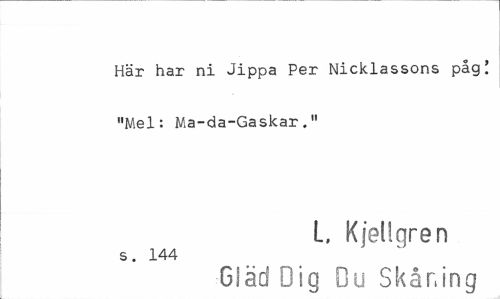 //// Här har ni Jippa Per Nicklassons påg! "Mel: Ma-da-Gaskar //// L, Kjellqren //// s. 144 //// Gläd Dig Du Skåning ////