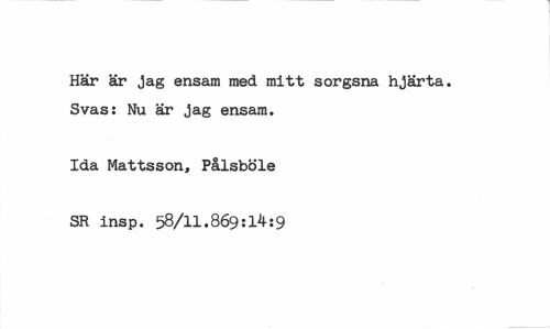 //// Här är jag ensam med mitt sorgsna hjärta. Svas: Nu är jag ensam. //// Ida Mattsson, Pålsböle //// SR insp. 58/11.869:1^:9 ////