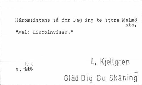 //// Häromsistens så for jag ing te stora Malmö //// sta, //// "Mel: Lincolnvisan." //// L, Kjellgren //// S . -i 18- //// Gläd Dig Du Skåning ////