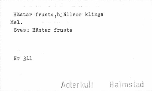 //// Hästar frusta,bjällror klinga Mel. //// Svas: Hästar frusta Nr 311 //// Adlerkui! Halmstad ////