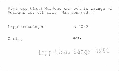 //// Högt upp bland Nordens snö och is sjunga vi Herrans lov och pris. Han som med,.V //// Lapplandssången s.20-21 //// 5 str. mel* //// La;, p- ks Gånger 1850 ////