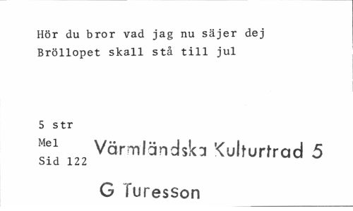 //// Hör du bror vad jag nu säjer dej Bröllopet skall stå till jul //// 5 str //// Mel Värmländska 'Culturtrad 5 //// Sid 122 //// G Turesson ////