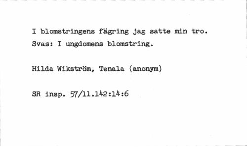 //// I blomstringens fägring jag satte min tro. Svass I ungdomens blomstring. //// Hilda Wikström, Tenala (anonym) //// SR insp. 57/11.142:14:6 ////