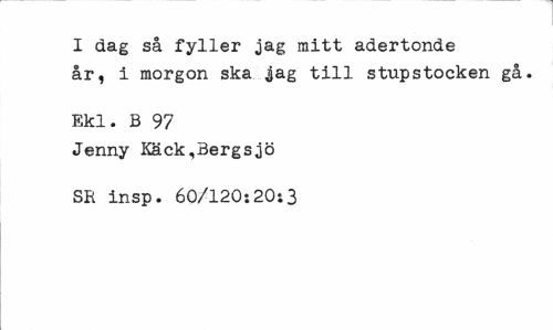 //// I dag så fyller jag mitt adertonde //// år, i morgon ska Jag till stupstocken gå. //// Ekl. B 97 //// Jenny Käck,Bergsjö //// SR insp. 60/120:20:3 ////