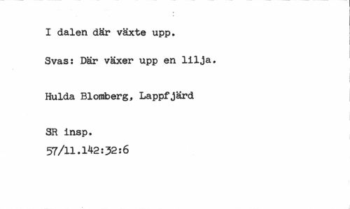 //// I dalen där växte upp. Svas: Där växer upp en lilja. //// Hulda Blomberg, Lappfjärd //// SR insp. 57/11.142:32:6 ////