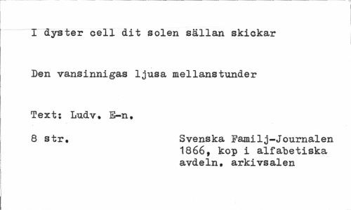 //// I dyster cell dit solen sällan skickar Den vansinnigas ljusa mellanstunder Text: Ludv. E-n, //// 8 str. Svenska Familj-Journalen //// 1866, kop i alfabetiska avdeln, arkivsalen ////