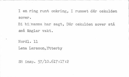 //// I en ring runt omkring, I rummet där oskulden sover. //// Bi bi,mamma har sagt, Där oskulden sover stå små änglar vakt. //// Nordl. 11 //// Lena Larsson,Ytterby SR insp. 57/10.617:17:2 ////