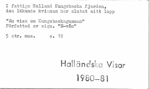 //// I fattiga Halland Kungsbacka fjorden, den läkande kvinnan har slutat sitt lopp //// "En visa om Kungsbackagumman" Författad av sign. "E-vén" //// 5 str. mus. s. 18 //// Halländske! Visor //// 1980-81 ////