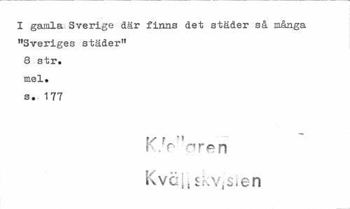 //// I gamla: Sverige där finns det städer så många "Sveriges städer" 8 str. mel. s. 177 //// 1/ r *' //// K. r oren Kvc i j skVjSi en ////