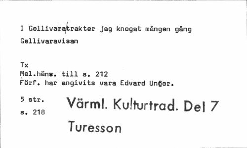 //// I //// I Gellivars^trakter jag knogat mången gång Gellivaravisan //// Tx //// Mel.häns. till s. 212 //// Förf. har angivits vara Edvard Un§er. //// Värml. Kulturtrad. Del 7 Turesson ////
