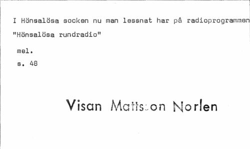 //// I Hönsalösa socken nu man lessnat har på radioprogramrnsr "Hönsalösa rundradio" //// mel. s. 48 //// Visan Matts:on Horlen ////