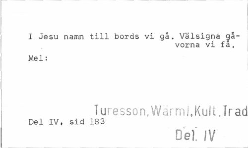 //// I Jesu namn till bords vi gå. Välsigna gåvorna vi få. //// Mel: //// Iuresson,Warml,Kuit. frac //// Del IV, sid 183 //// Del. IV ////