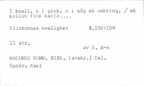 //// I knall, o i gick, o i säg mä omkring, / mä kollon fick kaffä ... //// Flickornas hemlighet 2.158-159 //// II str. //// av E. M-n //// MALUNGS KOMM. BIBL. (avskr.) Dal. Sporr, Karl ////