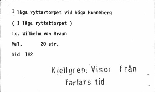 //// I låga ryttartorpet vid höga Hunneberg //// ( I låga ryttatrtorpet ) //// Tx. WilRelm von Braun //// Mel. 20 str. //// Sid 182 //// Kjell gr en-. Visor från fartars tid ////