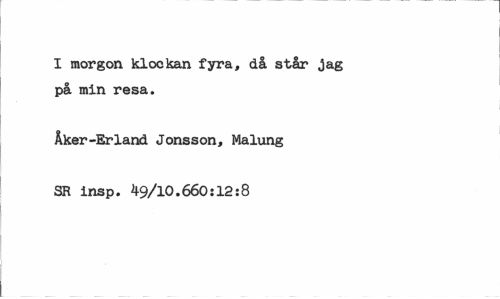 //// I morgon klockan fyra, då står jag på min resa. //// Åker-Erland Jonsson, Malung SR insp. 49/10.660:12:8 ////