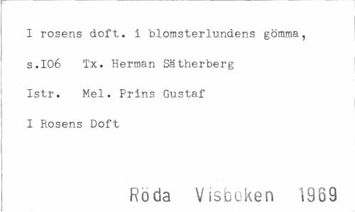 //// I rosens doft. i blomsterlundens gömma, s.I06 Tx. Herman Sätherberg Istr. Mel. Prins Gustaf I Rosens Doft //// Röda Visboken 1969 ////