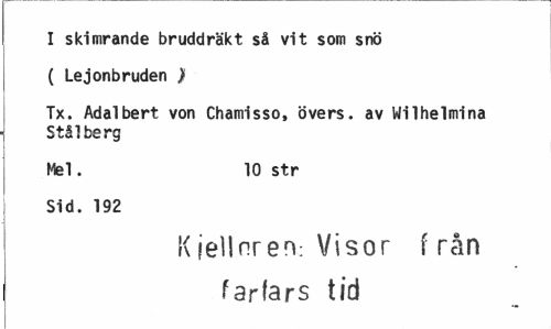 //// I skimrande bruddräkt så vit som snö ( Lejonbruden > //// Tx. Adalbert von Chamisso, övers, av Wilhelmina Stål berg //// Mel. 10 str //// Sid. 192 //// Kjellnren: Visor f rån farfars tid ////