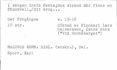 //// I skogen invid Femtsjöns strand där finns en fäbodvall,/dit drog... //// Det förgångna s. 15-16 //// 10 str. Diktad av Finnkari Lars //// Haivarsson, östra Fors ("Vid Gunhaberget") //// MALUNGS KOMM. BIBL. (avskr.), Dal. Sporr, Karl ////