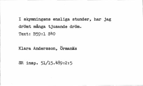 //// I skymningens ensliga stunder, har jag drömt många tjusande dröm. Text: B59:l S40 //// Klara Andersson, Örmanäs //// SE insp. 51/15.489:2:5 ////