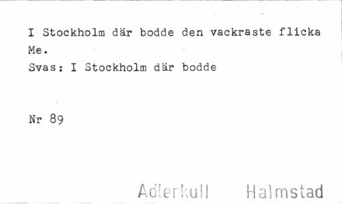 //// I Stockholm där bodde den vackraste flicka Me. //// Svas: I Stockholm där bodde Nr 89 //// Adterkull Halmstad ////