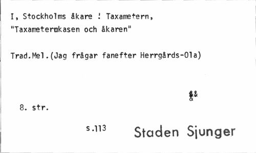 //// I, Stockholms åkare Taxametern, "Taxameternkasen och åkaren" //// Trad.Mel.(Jag frågar fanefter Herrgårds-Ola) //// ¥ //// 8. str. //// 5113 Staden Sjunger ////