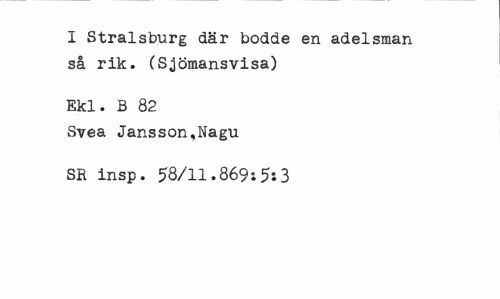 //// i Stralsburg där bodde en adelsman så rik. (Sjömansvisa) //// Ekl. B 82 //// Svea Jansson,Nagu //// SR insp. 58/11.869»5*3 ////