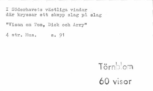 //// I Söderhavets västliga vindar där kryssar ett skepp slag på slag //// "Visan om Tom, Dick och Arry" //// 4 str. Mus. s. 91 //// Törnblom 60 visor ////