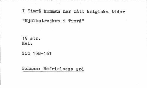 //// I Timrå kommun har rått krigiska tider "Mjölkstrejken i Timrå" //// 15 str. Mel. //// Sid 158-161 //// Bohman: Befrielsens ord ////