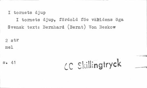 //// I tornets djup //// I tornets djup, fördold föe väibldens öga Svensk text: Bernhard (Bernt) Von Beskow //// 2 str mel //// CC Skillingtryck __ ////