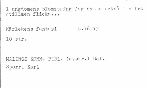 //// I ungdomens blomstring jag satte också min tro /tillsen flicka... //// Kärlekens fantasi S.H6-U7 10 str. //// MALINGS KOMM. BIBL. (avskr.) Dal. Sporr, Karl ////