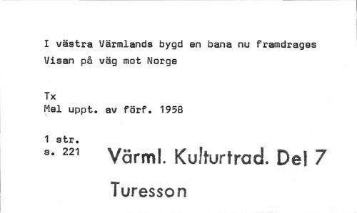 //// I västra Värmlands bygd en bana nu framdragas Visan på väg mot Norge //// Tx //// Mel uppt. av förf. 1958 1 str. //// " 221 Värml. Kufturtrad. Del 7 Turesson ////