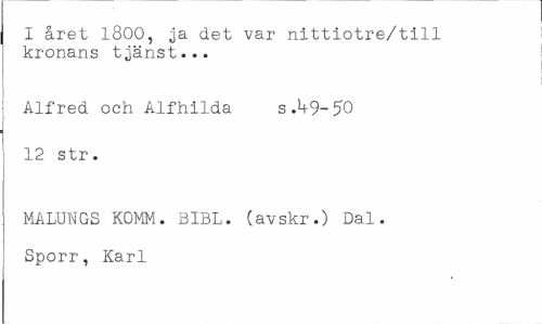 //// I året 1800, ja det var nittiotre/till kronans tjänst... //// Alfred och Alfhilda s .1+9- 50 12 str. //// MALUNGS KOMM. BIBL. (avskr.) Dal. Sporr, Karl ////