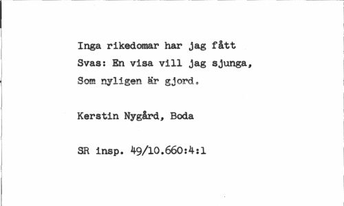 //// Inga rikedomar har jag fått Svas: En visa vill jag sjunga, Som nyligen är gjord. //// Kerstin Nygård, Boda //// SR insp. 49/10.660:4:1 ////