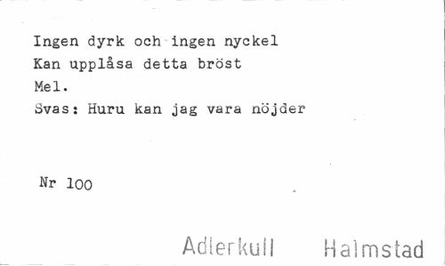 //// Ingen dyrk och ingen nyckel Kan upplåsa detta bröst Mel. //// Svas: Huru kan jag vara nöjder Nr 100 //// Adlerkuli Halmstad ////