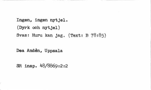 //// Ingen, ingen nytjel. (Dyrk och nytjel) //// Svas: Huru kan jag. (Text: B 78:85) Dea Andén, Uppsala SR insp. 48/8869:2:2 ////