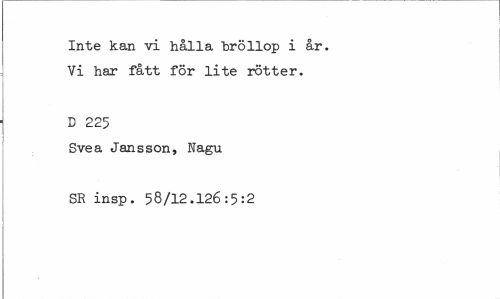 //// Inte kan vi hålla bröllop i år. Vi har fått för lite rötter. //// D 225 //// Svea Jansson, Nagu SE insp. 58/12.126:5:2 ////