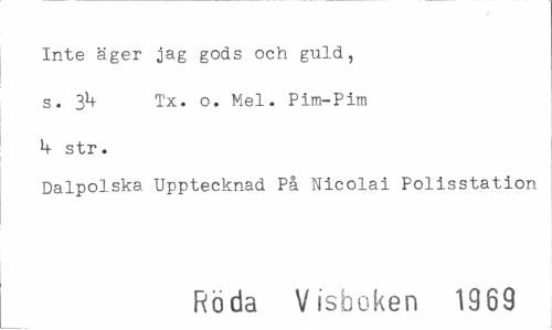 //// Inte äger jag gods och guld, s. 3*+ Tx. o. Mel. Pim-Pim M- str. //// Dalpolska Upptecknad På Nicolai Polisstation //// Röda Visboken 1969 ////