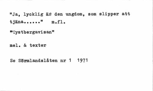 //// "Ja, lycklig är den ungdom, som slipper att tjäna..." m.fl. //// "Tys t"ber gavi s an" mel. & texter //// Se Sörmlandslåten nr 1 1971 ////