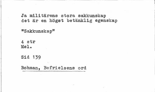 //// Ja militärens stora sakkunskap det är en högst betänklig egenskap //// "Sakkunskap" //// 4 str Mel. //// Sid 139 //// Bohman, Befrielsens ord ////