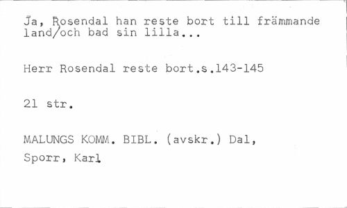 //// Ja, Rosendal han reste bort till främmande land/och bad sin lilla... //// Herr Rosendal reste bort.s.143-145 //// 21 str. //// MALUNGS KOMA. BIBL. (avskr.) Dal, Sporr, Karl ////