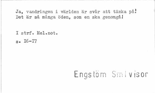 //// Ja, vandringen i världen är svår att tänka påi Det är så många öden, som en ska genomgåJ //// I strf. Mel.not. s. 16-17 //// Engstöm Sm! visor ////
