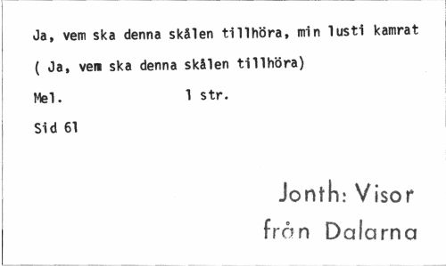 //// Ja, vem ska denna skålen tillhöra, min lusti kamrat ( Ja, ven ska denna skålen tillhöra) Mel. 1 str. //// Sid 61 //// Jonth: Visor från Dalarna ////