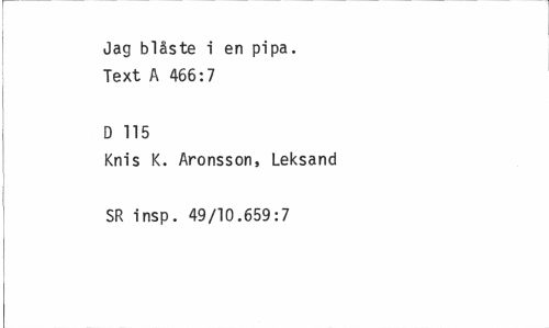 //// Jag blåste i en pipa. Text A 466:7 //// D 115 //// Knis K. Aronsson, Leksand SR insp. 49/10.659:7 ////