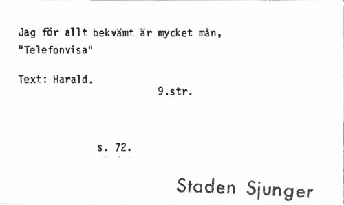 //// Jag för allt bekvämt är mycket mån, "Telefonvisa" //// Text: Harald. //// 9.str. //// s. 72. //// Staden Sjunger ////