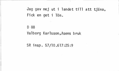 //// Jag gav mej ut i landet till att tjäna, Fick en get i lön. //// D 88 //// Valborg Karlsson,Åsens bruk SR insp. 57/10.617:25:9 ////