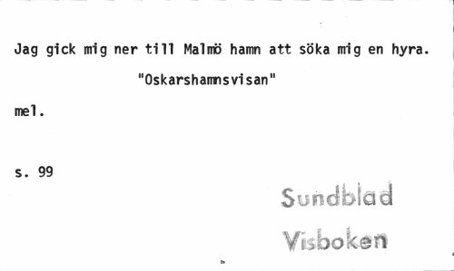 //// Jag gick mig ner till Malmö hamn att söka mig en hyra. "Oskarshamnsvi san" //// mel. s. 99 //// Sumdbfad //// Visboken //// b ////