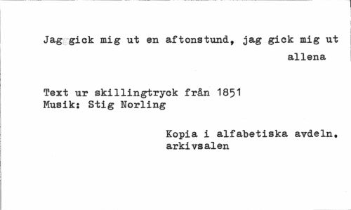//// Jag gick mig ut en aftonstund, jag gick mig ut //// allena //// Text ur skillingtryck från 1851 Musik: Stig Norling //// Kopia i alfabetiska avdeln. arkivsalen ////
