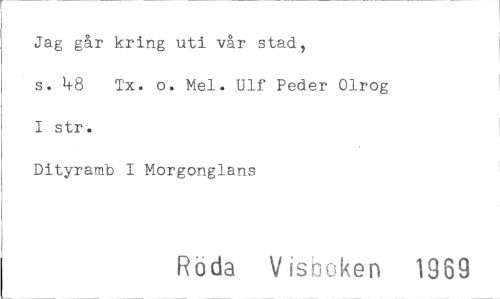 //// Jag går kring uti vår stad, //// s. bQ Tx. o. Mel. Ulf Peder Olrog //// I str. //// Dityramb I Morgonglans //// Röda Visboken 1969 ////