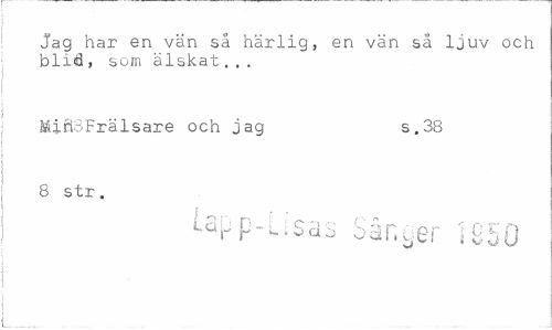 //// Jag har en vän så härlig, en vän så ljuv och blid, som älskat... //// MifiSFrälsare och jag s.38 //// 8 str. //// L3|jp-Lisas Sånger 1850 ////