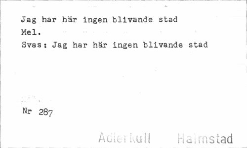 //// Jag har här ingen blivande stad Mel. //// Svas: Jag har här ingen blivande stad Nr 287 //// Auti kull Haimstad ////
